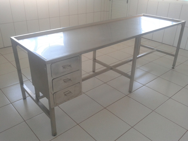 Fabricada em aço inox AISI 304, em chapas de 1,5 ou 2mm de espessura Base do tampo em tubos aço inox 304 20x30 Pes em tubos de aço inox 304, com regulagem de nivel Trava entre os pes em tubos de aço inox 304. Equipamento com qualidade e durabilidade, fabricado de acordo com a necessidade do cliente.
